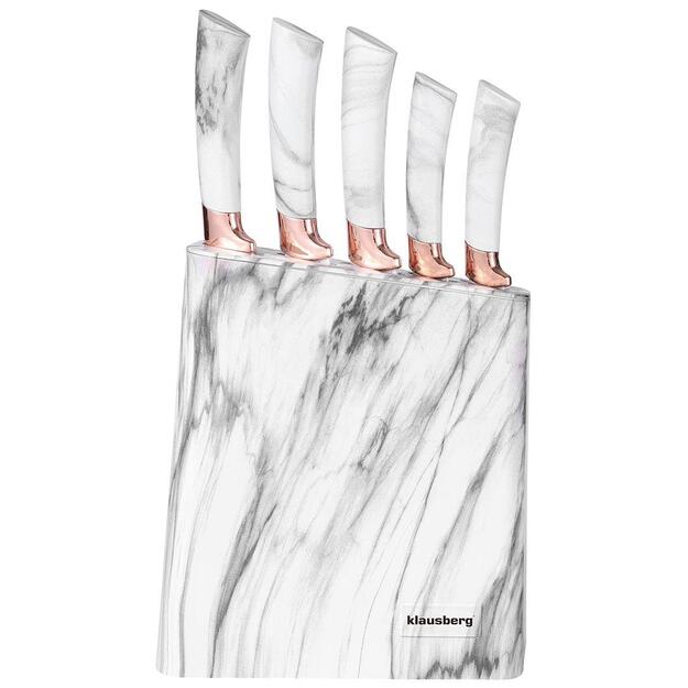 Klausberg KB-7769 – elegantiškas virtuvinių peilių rinkinys, pagamintas iš aukštos kokybės nerūdijančio plieno su nelimpančia danga. Ergonomiškos rankenos užtikrina patogų naudojimą. Rinkinį sudaro: 20 cm virėjo peilis, 20 cm pjaustymo peilis, 20 cm duonos peilis, 12,5 cm universalus peilis, 9 cm lupimo peilis ir stovas saugiam laikymui.